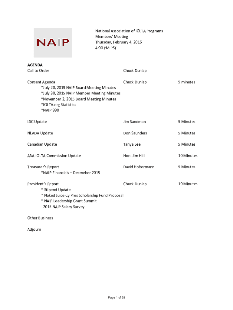 National Association of VOLTA Programs Members Meeting Thursday, February 4, 2016 4:00 PM STAGED Call to Order Chuck DunlapConsent Agenda Chuck Dunlap *July 20, 2015, NAIL Board Meeting Minutes *July