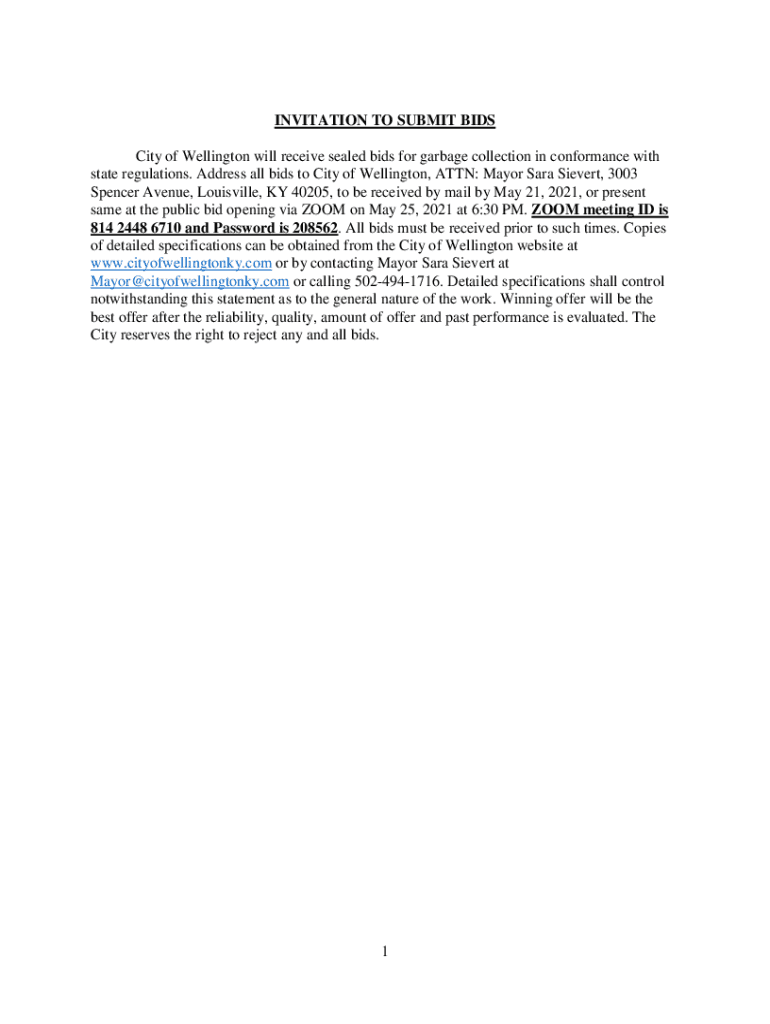 INVITATION TO SUBMIT BIDS City of Wellington will receive sealed bids for garbage collection in conformance with state regulations. Address all bids to City of Wellington, ATTN: Mayor Sara Sievert,