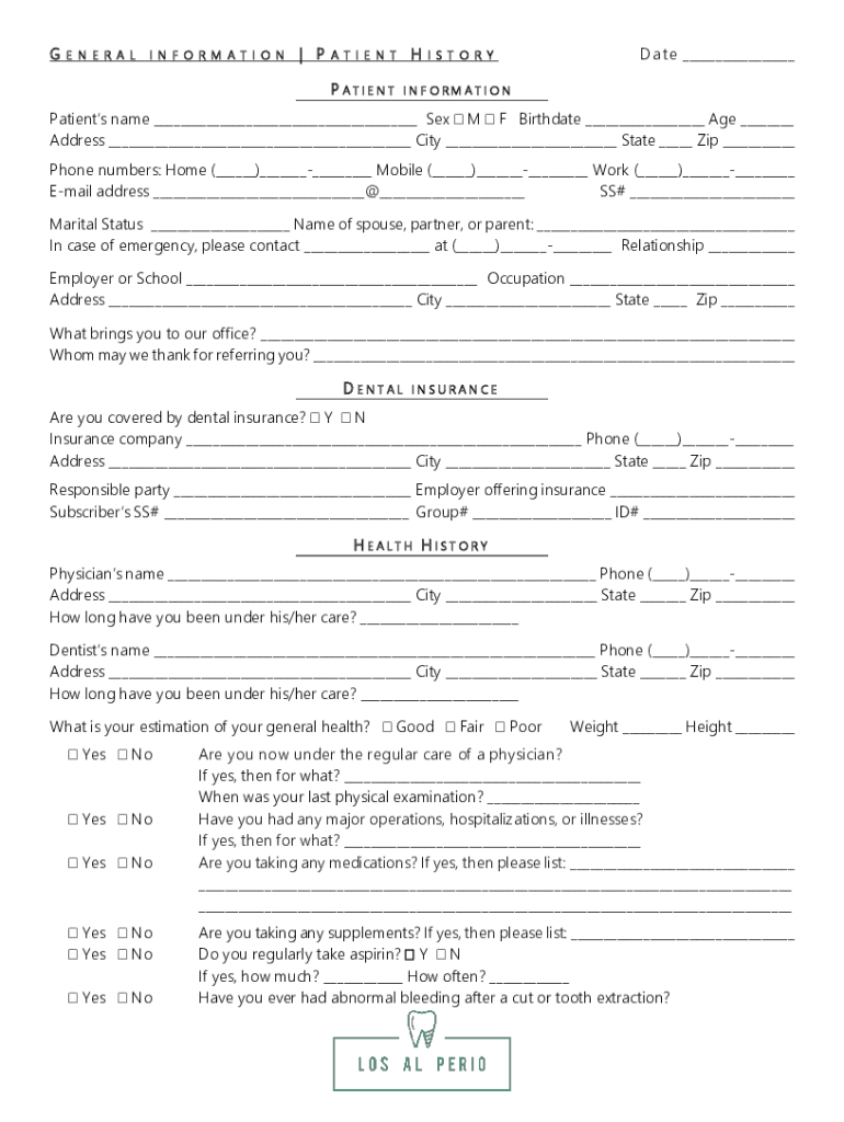 GE N E R A LI N F O R M A T I O N PA T I E N TPATIENTHDa the S T O R I N F O RM A T I ON Patients name Sex M F Birthdate Age Address City State Zip Phone numbers: Home () Mobile () Work () Email address