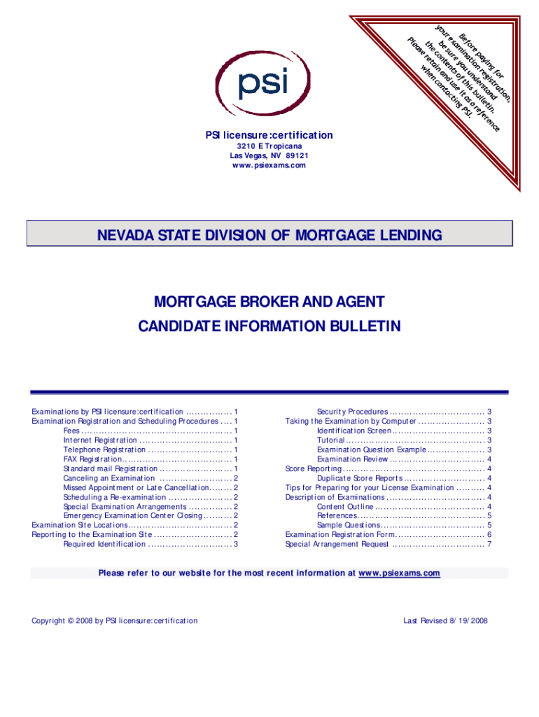 PSI licensure:certification 3210 E Tropicana Las Vegas, NV 89121 www.psiexams.comNEVADA STATE DIVISION OF MORTGAGE LENDINGMORTGAGE BROKER AND AGENT CANDIDATE INFORMATION BULLETINExaminations by PSI