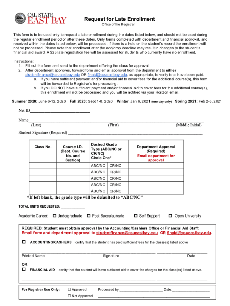 Request for Late Enrollment Office of the Registrants form is to be used only to request a late enrollment during the dates listed below, and should not be used during the regular enrollment period