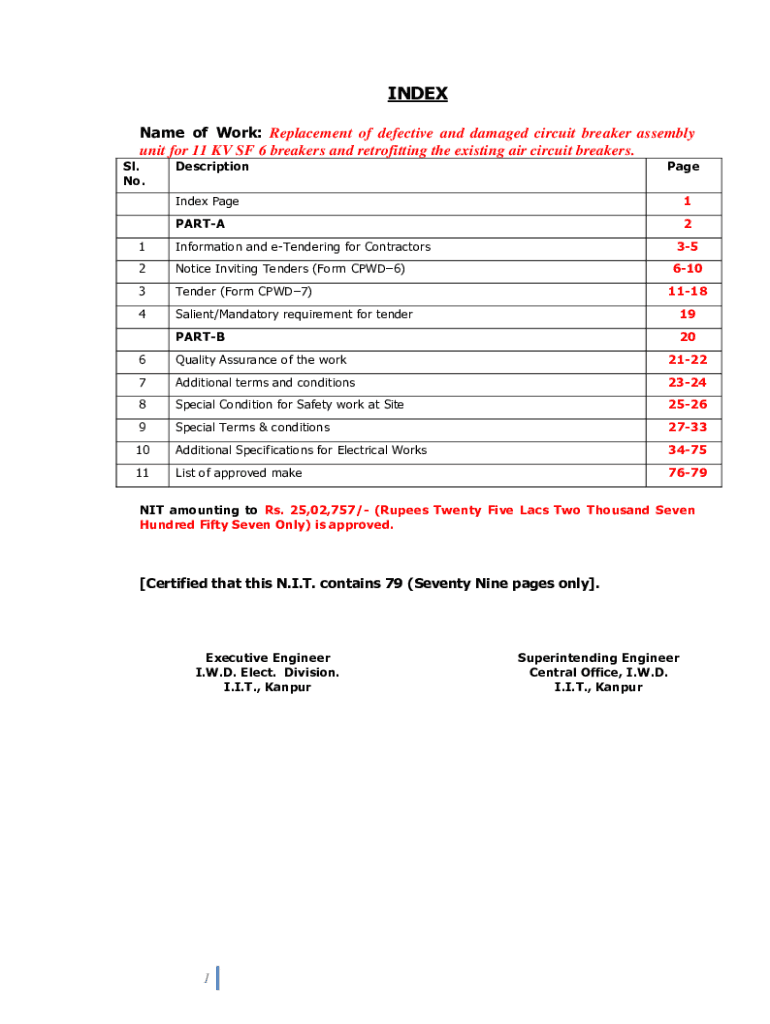 INDEX Name of Work: Replacement of defective and damaged circuit breaker assembly unit for 11 KV SF 6 breakers and retrofitting the existing air circuit breakers. SL. No. DescriptionPageIndex Page1PARTA21Information