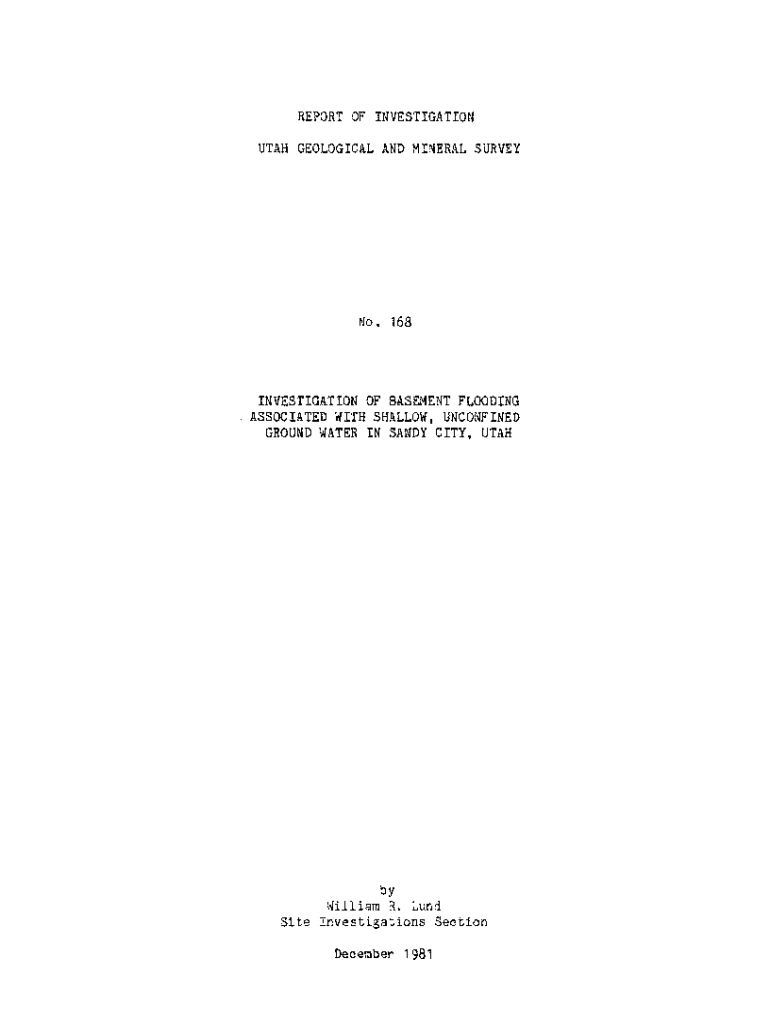 REPORT OF INVESTIGATION UTAH GEOLOGICAL AND MINERAL SURVEY No. 168INVESTIGATION OF BASEMENT FLOODING ASSOCIATED WITH SHALLOW, UNCONFINED GROUND WATER IN SANDY CITY, Utah William R. Land Site Investigations