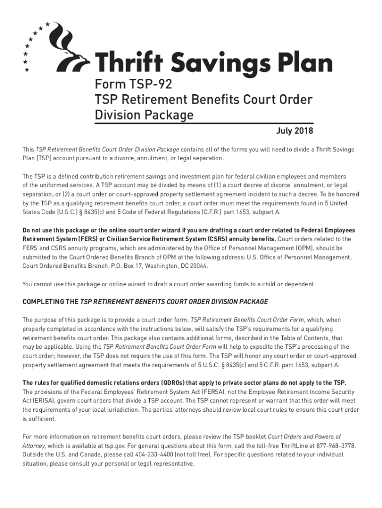 Get the free PDF Form TSP-92, TSP Retirement Benefits Court Order Division Package