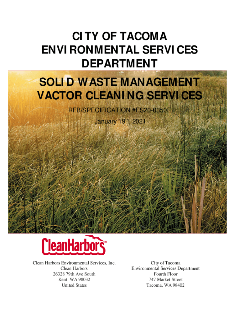 CITY OF TACOMA ENVIRONMENTAL SERVICES DEPARTMENT SOLID WASTE MANAGEMENT ACTOR CLEANING SERVICES ROB/SPECIFICATION #ES200350F January 19th, 2021Clean Harbors Environmental Services, Inc. Clean Harbors