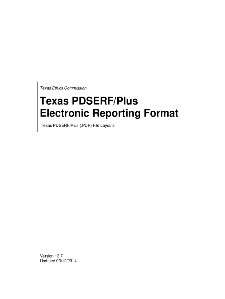 Texas Ethics Commission Texas PDS ERF/Plus Electronic Reporting Format Texas PDS ERF/Plus (.PDP) File LayoutsVersion 13.7 Updated 03/12/2014Page1PDSERF/Plus Electronic Reporting Format #13.7 Texas