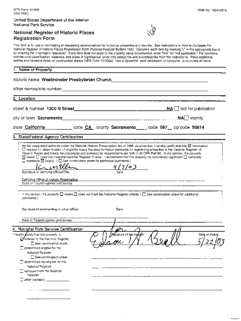 NFS Form 10900 (Oct. 1990)OMB No. 10240018United States Department of the Interior National Park Service national Register of Historic Places Registration Forms “This form is for use in nominating