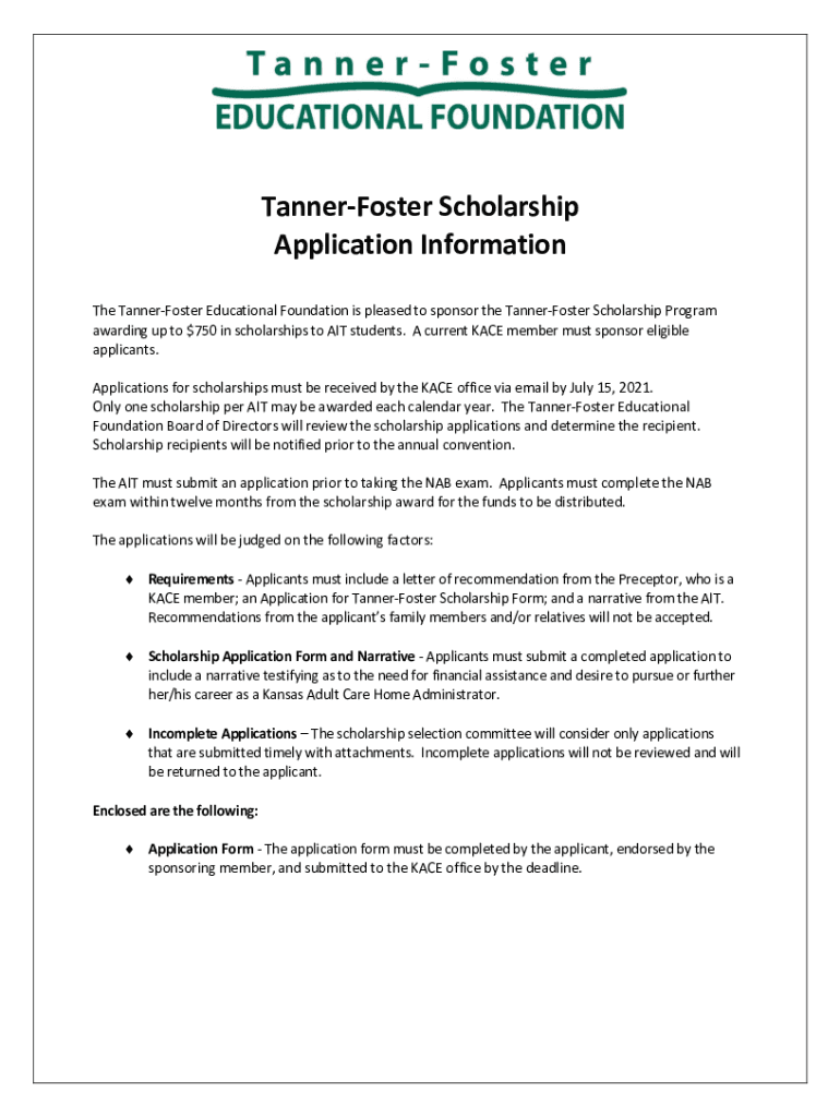 Get the free Tanner-Foster Scholarship Application Information - kansasadultcareexecutives wildap...