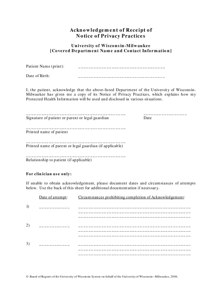 Acknowledgement of Receipt of Notice of Privacy Practices University of Wisconsin Milwaukee Covered Department Name and Contact Information Patient Name (print): Date of Birth: I, the patient, acknowledge