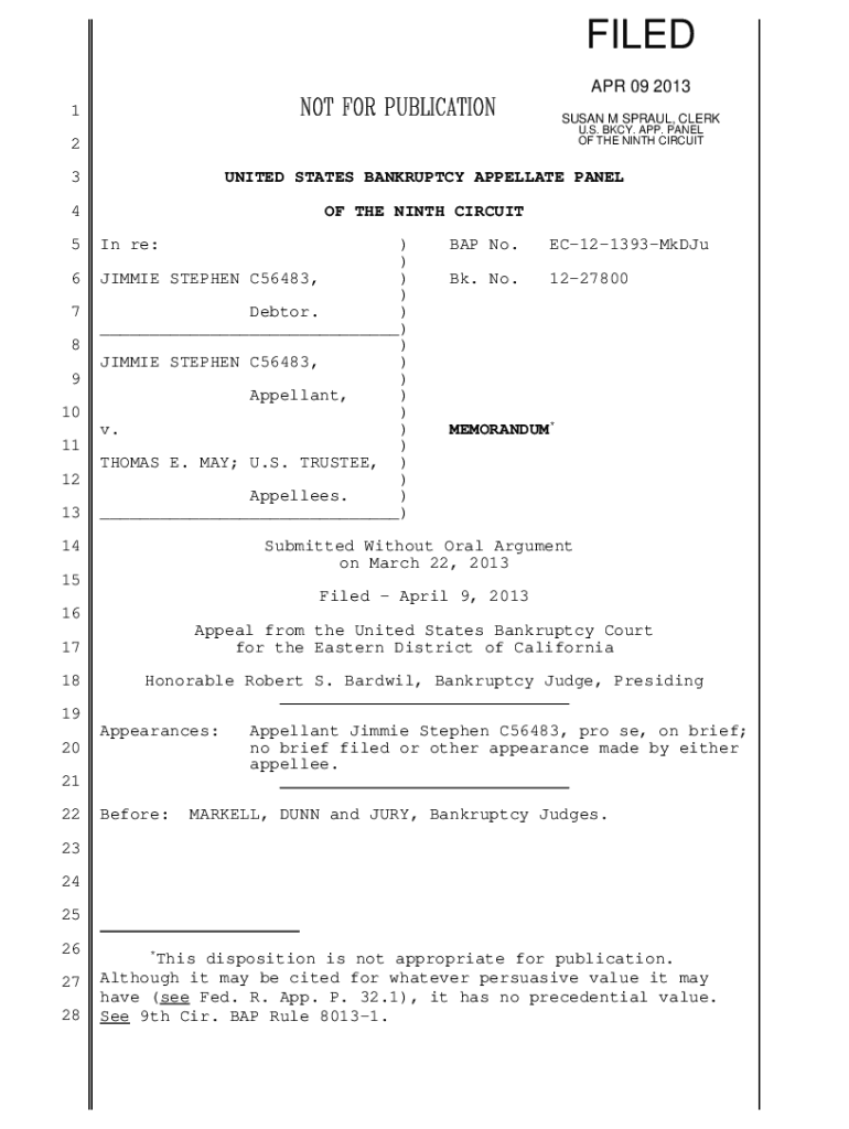 FILED APR 09 2013 1SUSAN M SPRAWL, CLERK U.S. BCY. APP. PANEL OF THE NINTH CIRCUIT2 3UNITED STATES BANKRUPTCY APPELLATE PANEL4OF THE NINTH CIRCUIT5 6 7 8 9 10 11 12 13In re:)) JIMMIE STEPHEN C56483,))