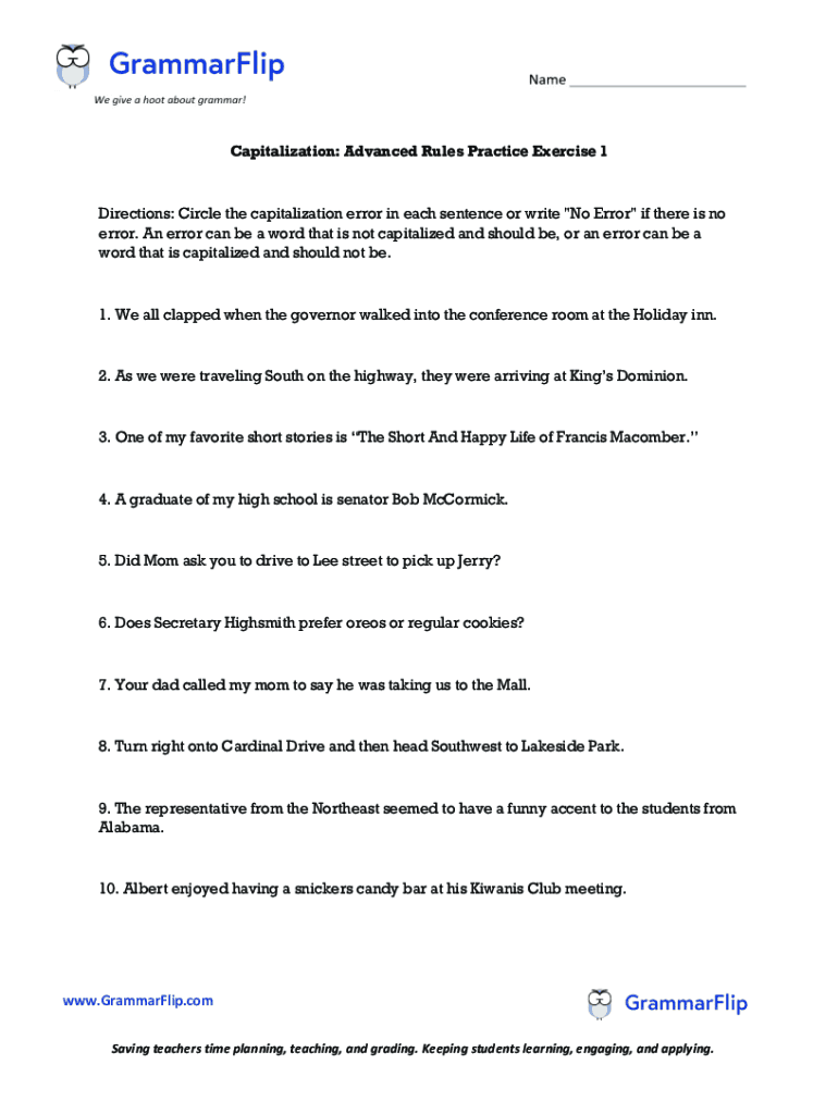 Capitalization: Advanced Rules Practice Exercise 1Directions: Circle the capitalization error in each sentence or write No Error if there is no error. An error can be a word that is not capitalized