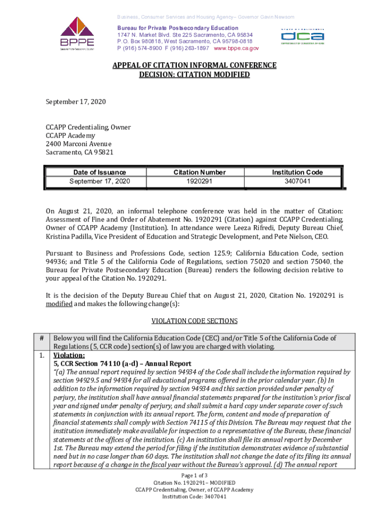Get the free Bureau for Private Postsecondary Education - CCAPP Academy - Appeal of Citation Info...
