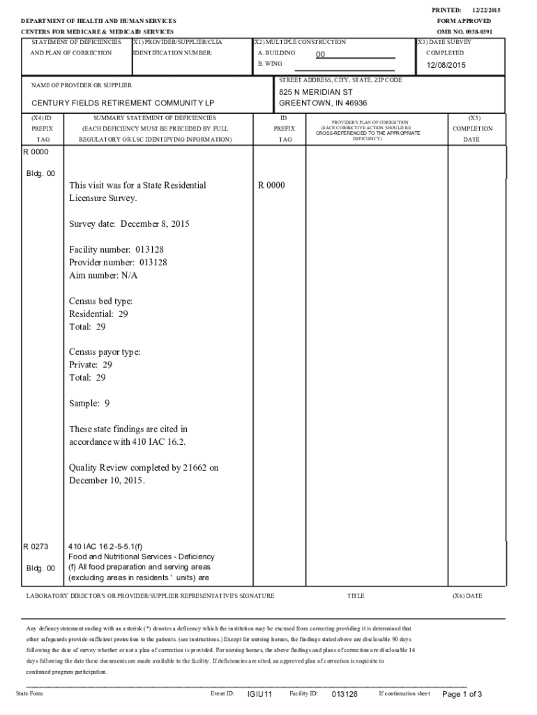 PRINTED: DEPARTMENT OF HEALTH AND HUMAN SERVICES CENTERS FOR MEDICARE & MEDICAID SERVICES STATEMENT OF DEFICIENCIES(X1) PROVIDER/SUPPLIER/LIGAND PLAN OF CORRECTIONIDENTIFICATION NUMBER:12/22/2015FORM