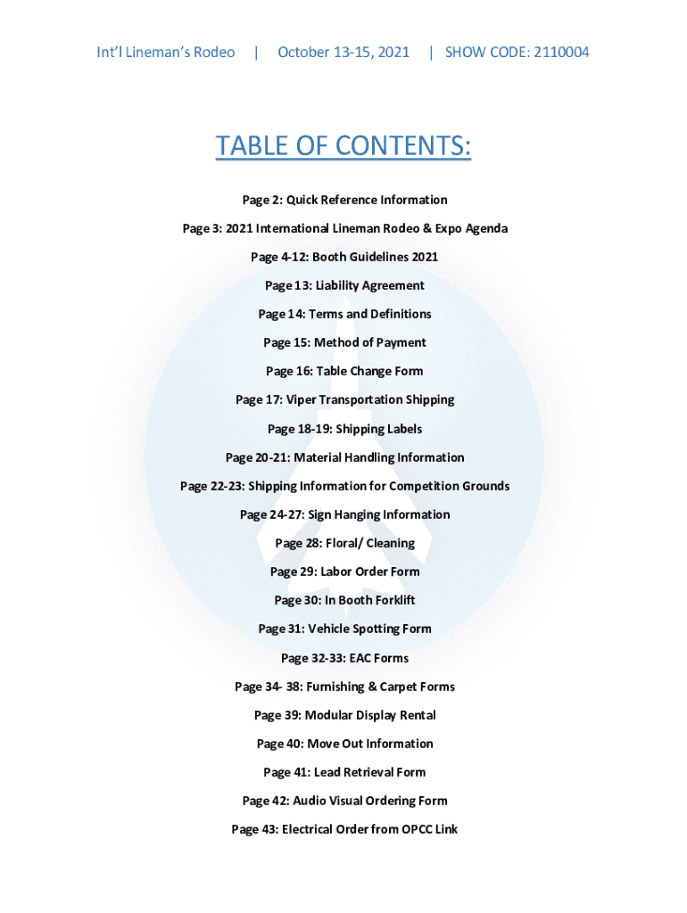 Into Lineman Rodeo October 1315, 2021 SHOW CODE: 2110004TABLE OF CONTENTS: Page 2: Quick Reference Information Page 3: 2021 International Lineman Rodeo & Expo Agenda Page 412: Booth Guidelines 2021-Page