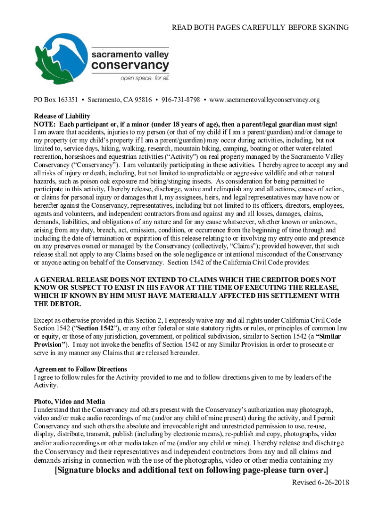 READ BOTH PAGES CAREFULLY BEFORE SIGNING PO Box 163351 Sacramento, CA 95816 9167318798 www.sacramentovalleyconservancy.org Release of Liability NOTE: Each participant or, if a minor (under 18 years