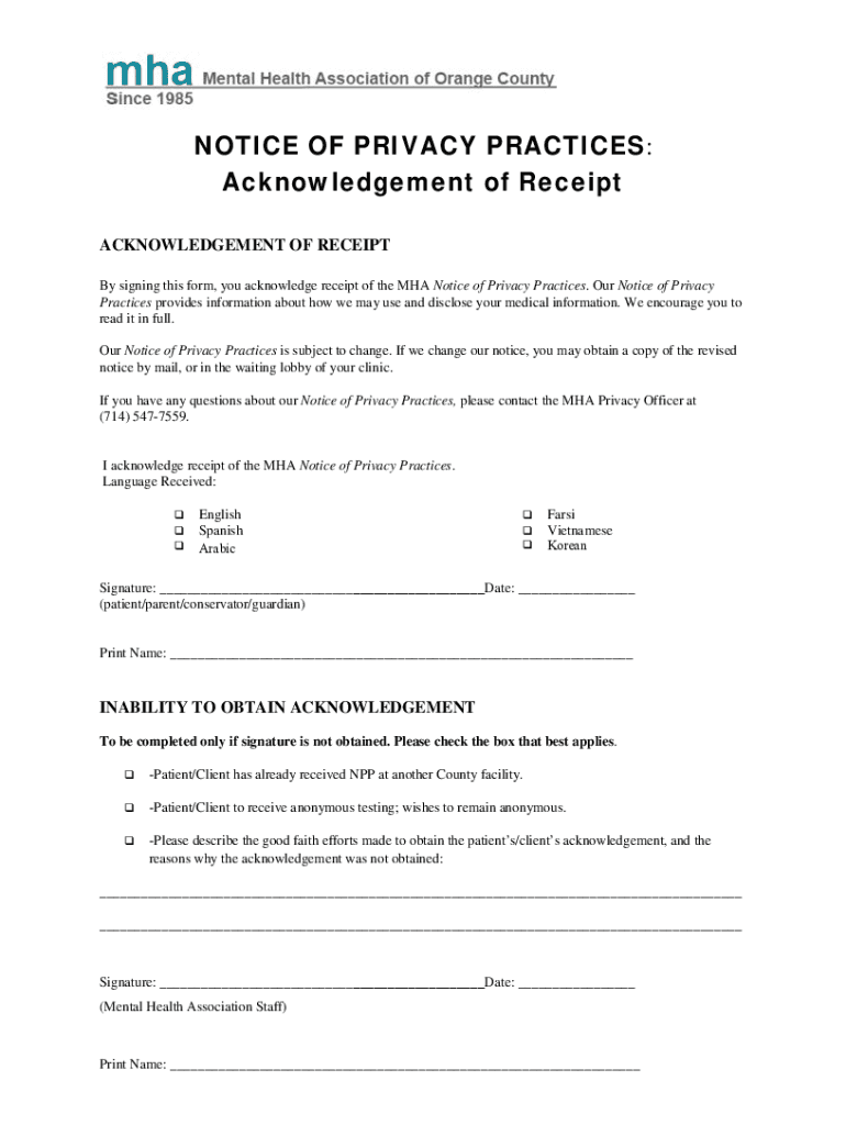 Get the free NOTICE OF PRIVACY PRACTICES Acknowledgement of Receipt - MHAOC