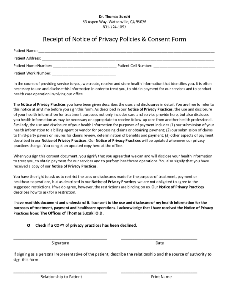 Dr. Thomas Suzuki 53 Aspen Way. Watsonville, CA 95076 8317241097Receipt of Notice of Privacy Policies & Consent Form Patient Name: Patient Address: Patient Home Number: Patient Cell Number: Patient