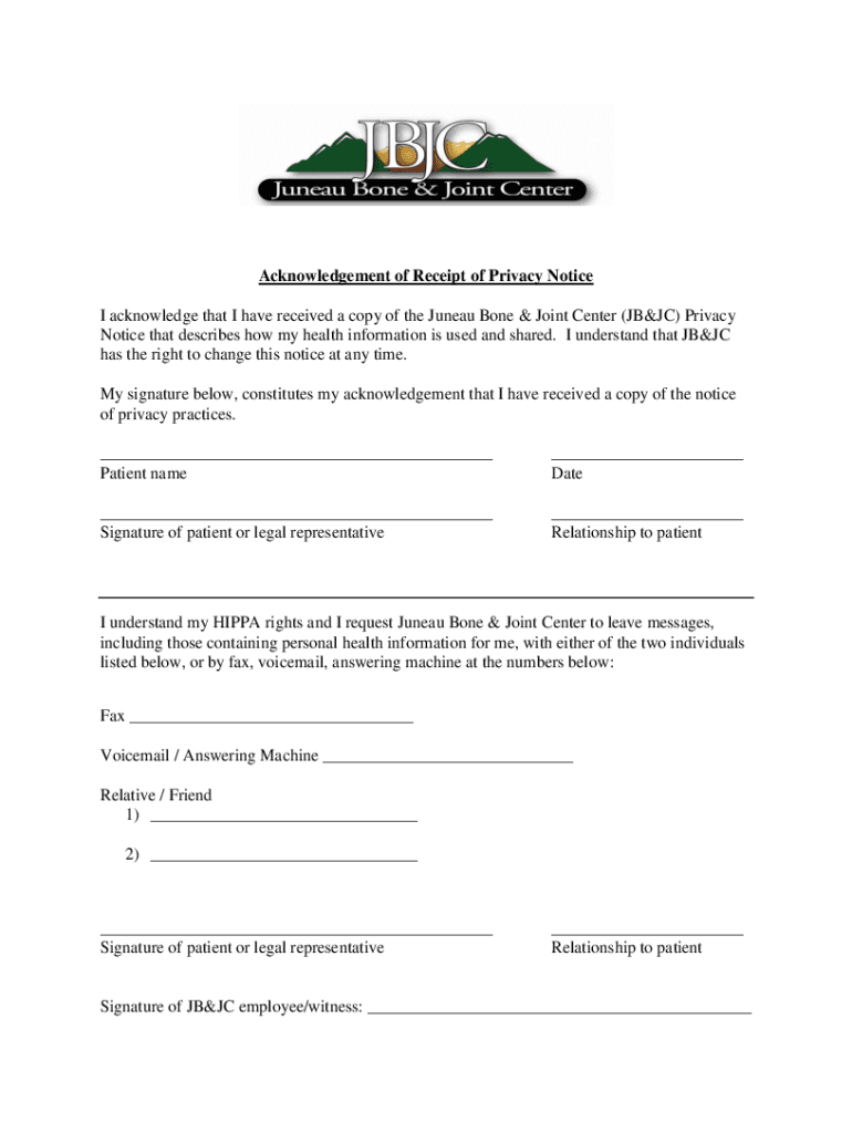 Acknowledgement of Receipt of Privacy Notice I acknowledge that I have received a copy of the Juneau Bone & Joint Center (BJC) Privacy Notice that describes how my health information is used and shared.