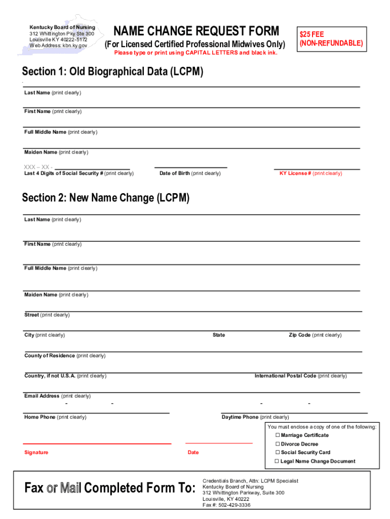 Kentucky Board of Nursing 312 Whittington Pay Ste 300 Louisville KY 402225172 Web Address: CBN.KY.game CHANGE REQUEST FORM$25 FEE (NONREFUNDABLE)(For Licensed Certified Professional Midwives Only)