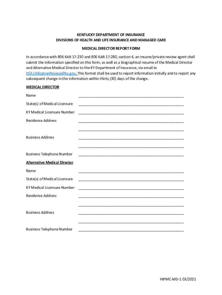 KENTUCKY DEPARTMENT OF INSURANCE DIVISIONS OF HEALTH AND LIFE INSURANCE AND MANAGED CARE MEDICAL DIRECTOR REPORT FORM In accordance with 806 Cars 17:230 and 806 Cars 17:280, section 4, an insurer/private
