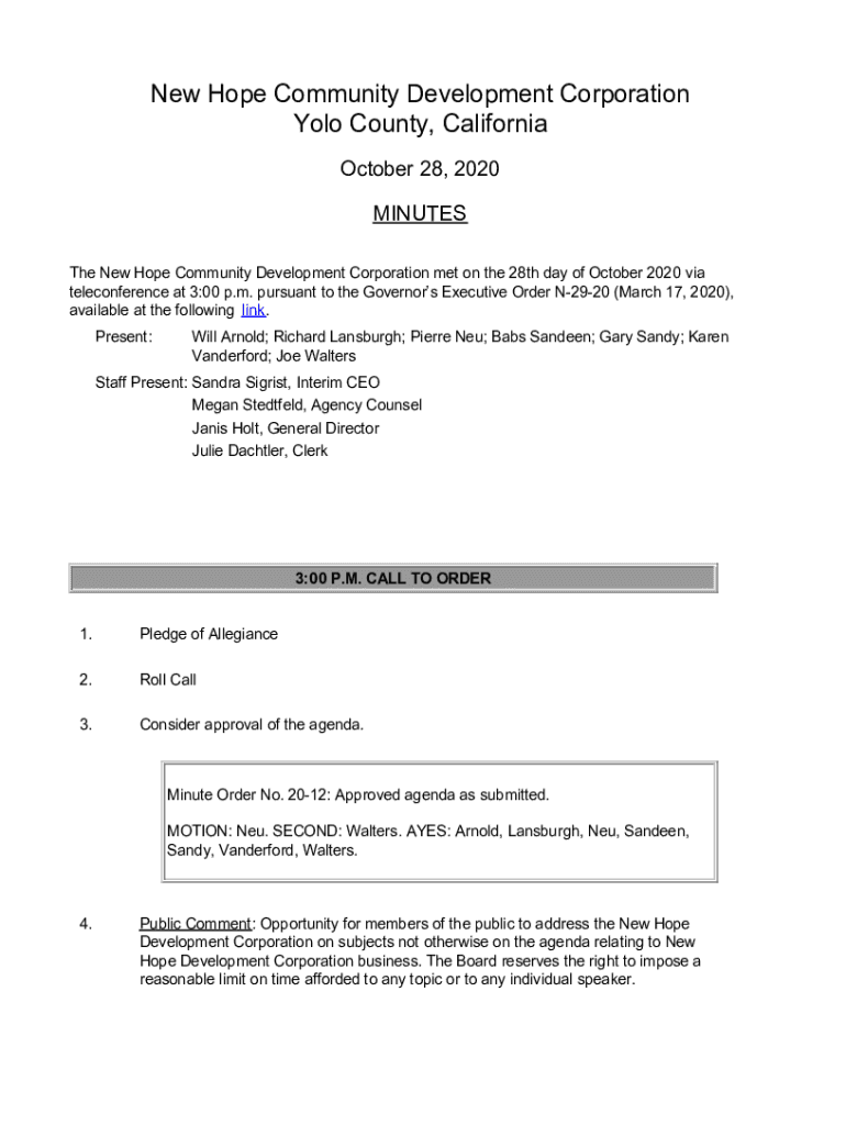 New Hope Community Development Corporation YOLO County, California October 28, 2020, MINUTES The New Hope Community Development Corporation met on the 28th day of October 2020 via teleconference at