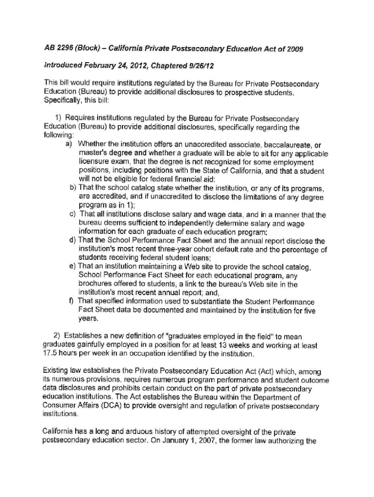 AB 2296 (Block) California Private Postsecondary Education Act of 2009 Introduced February 24, 2012, Chartered 9126/12 This bill would require institutions regulated by the Bureau for Private Postsecondary