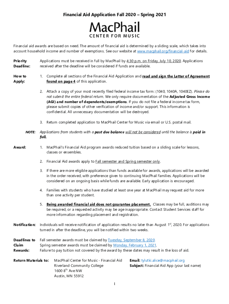 Financial Aid Application Fall 2020 Spring 2021Financial aid awards are based on need. The amount of financial aid is determined by a sliding scale, which takes into account household income and number