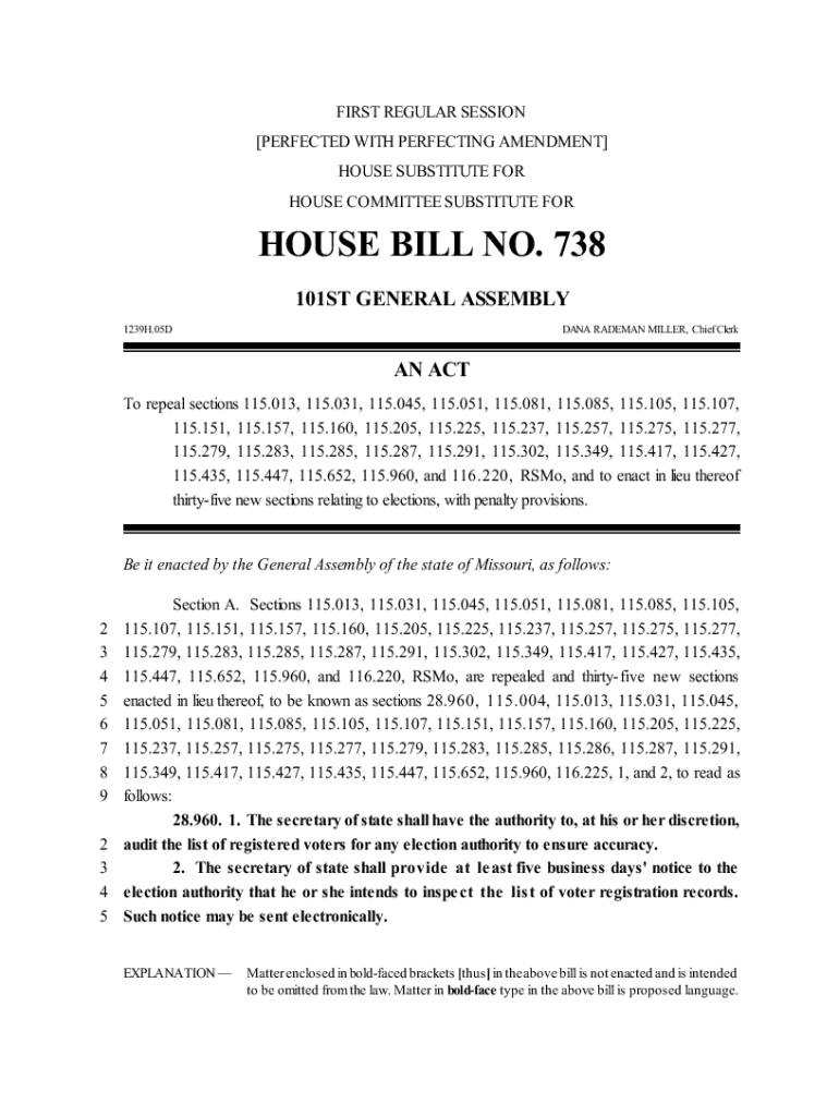FIRST REGULAR SESSION PERFECTED WITH PERFECTING AMENDMENT HOUSE SUBSTITUTE FOR HOUSE COMMITTEE SUBSTITUTE FARMHOUSE BILL NO. 738 101ST GENERAL ASSEMBLY 1239H.05DDANA BASEMAN MILLER, Chief Clerk AN