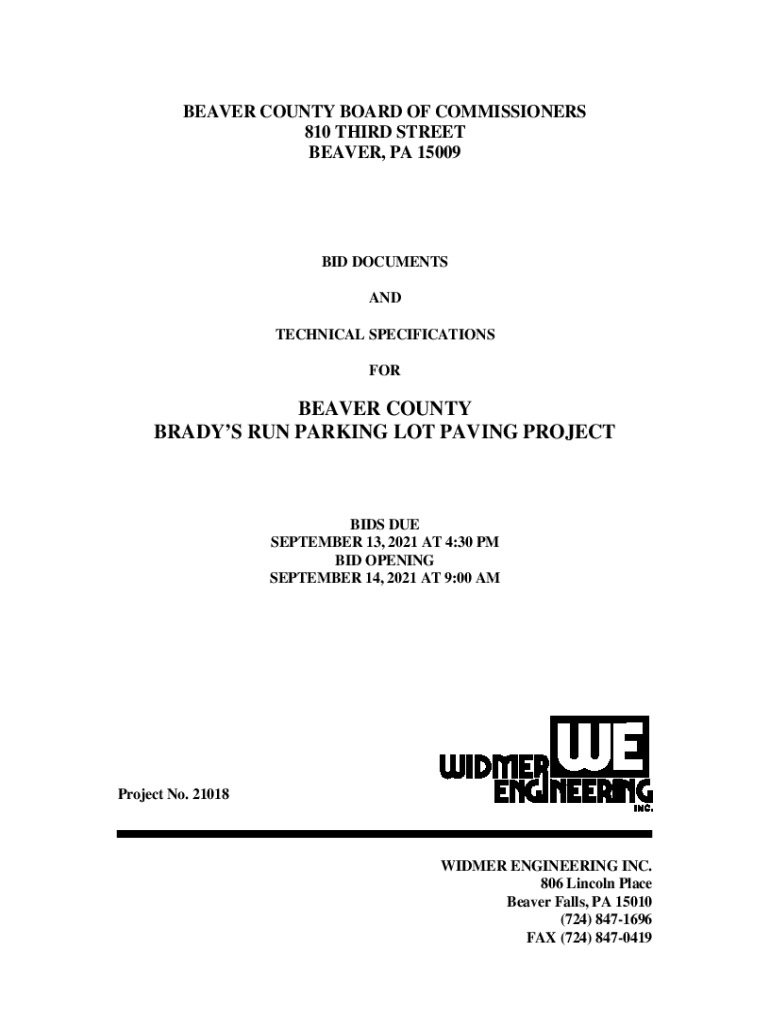 BEAVER COUNTY BOARD OF COMMISSIONERS 810 THIRD STREET BEAVER, PA 15009BID DOCUMENTS AND TECHNICAL SPECIFICATIONS FOREVER COUNTY BRADY RUN PARKING LOT PAVING PROJECTS DUE SEPTEMBER 13, 2021, AT 4:30