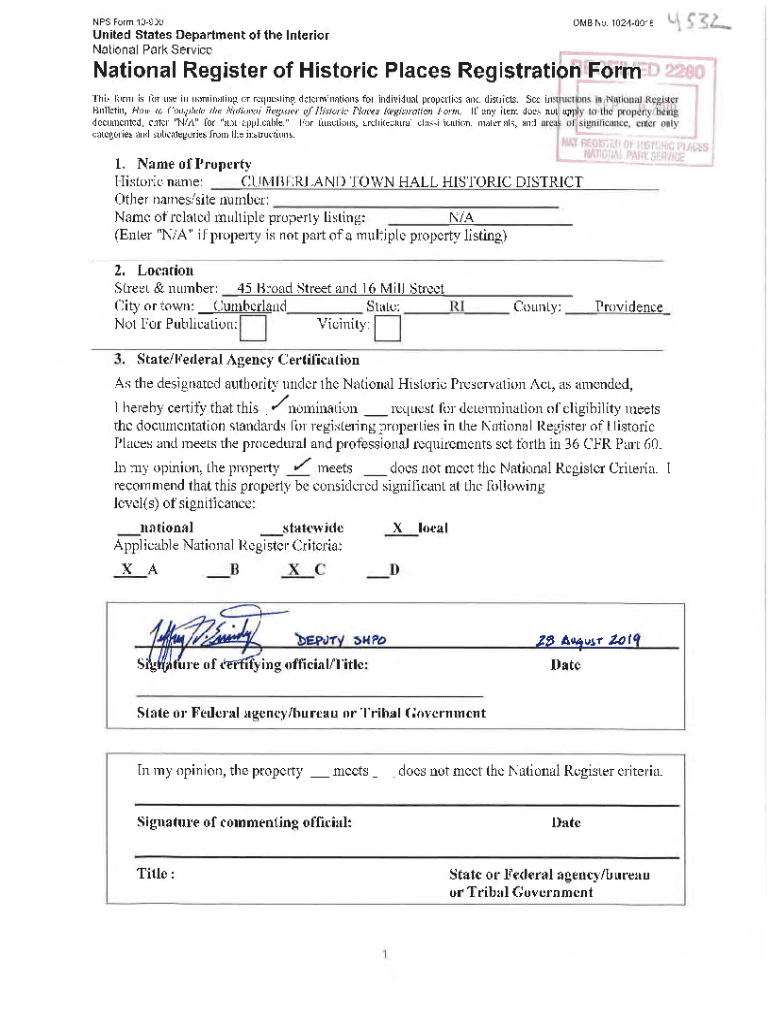 United States Department of the Interior National Park Service / National Register of Historic Places Registration Form NPS Form 10900OMB No. 10240018CUMBERLAND TOWN HALL HISTORIC DISTRICTPROVIDENCE