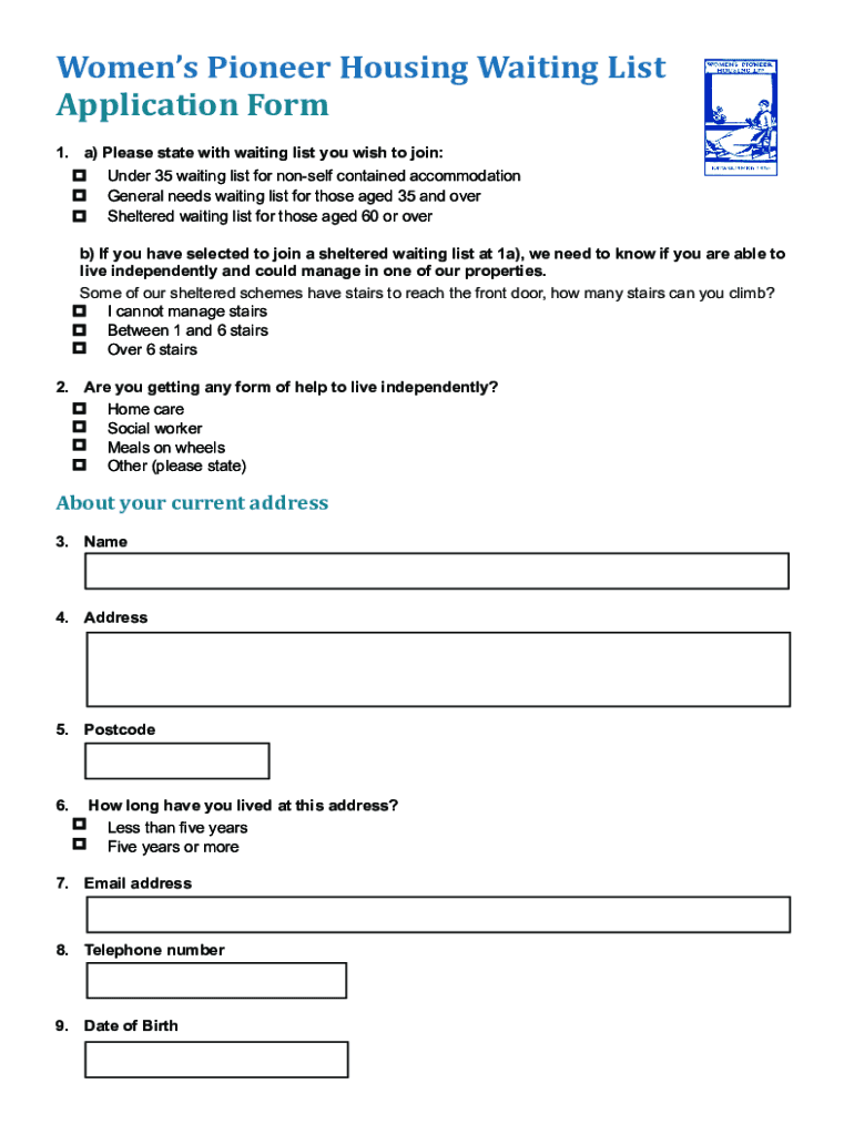 Women's Pioneer Housing Waiting List Application Form 1.a) Please state with waiting list you wish to join:Under 35 waiting list for nonself contained accommodation General needs waiting list for