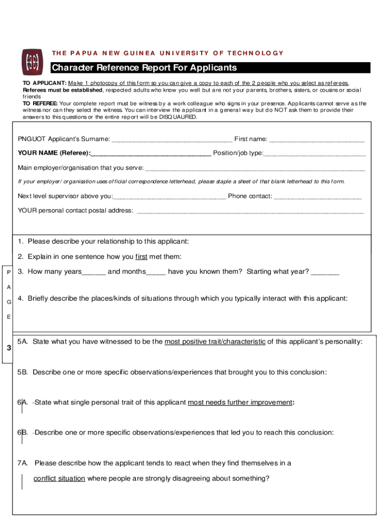 THE Papua New Guinea UNIVERSITY OF TECHNOLOGYCharacter Reference Report For Applicants TO APPLICANT: Make 1 photocopy of this form, so you can give a copy to each of the 2 people who you select as