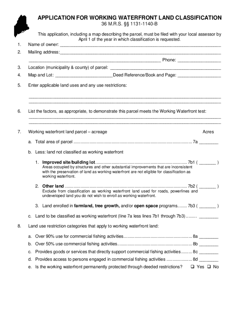 APPLICATION FOR WORKING WATERFRONT LAND CLASSIFICATION 36 M.R.S. 11311140B1. This application, including a map describing the parcel, must be filed with your local assessor by April 1 of the year
