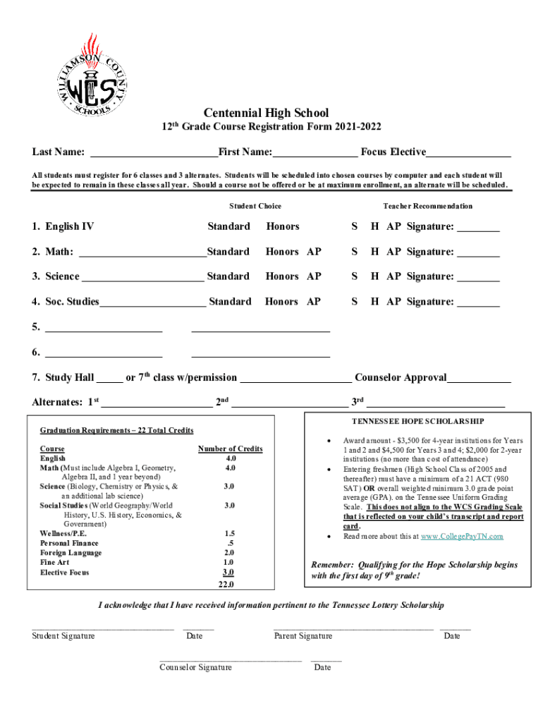 Centennial High School 12th Grade Course Registration Form 20212022 Last Name: First Name: Focus Elective All students must register for 6 classes and 3 alternates. Students will be scheduled into