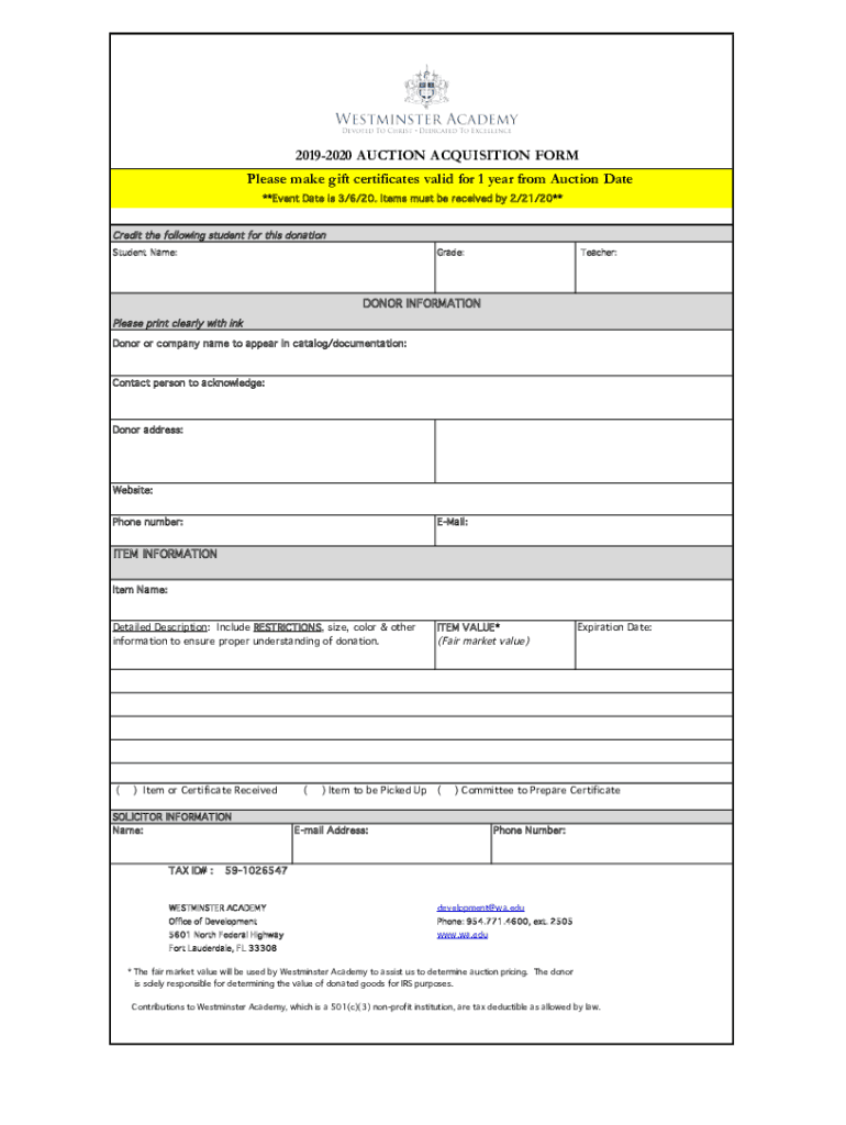 20192020 AUCTION ACQUISITION FORM Please make gift certificates valid for 1 year from Auction Date **Event Date is 3/6/20. Items must be received by 2/21/20**Credit the following student for this