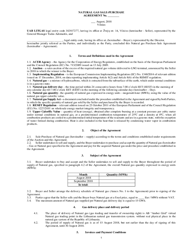 Get the free NATURAL GAS SALE-PURCHASE AGREEMENT No. UAB LITGAS legal ...