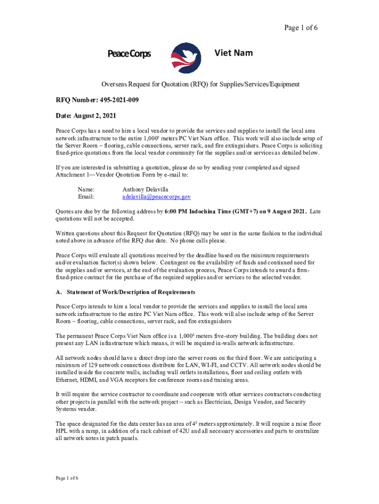 Page 1 of 6Peace Corpse Overseas Request for Quotation (RFQ) for Supplies/Services/Equipment RFQ Number: 4952021009 Date: August 2, 2021, Peace Corps has a need to hire a local vendor to provide the
