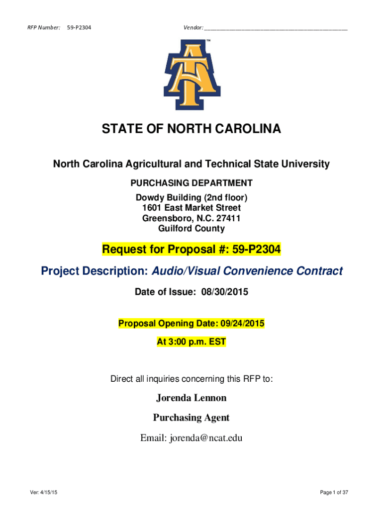 Renumber:59P2304Vendor: STATE OF NORTH CAROLINA Agricultural and Technical State University PURCHASING DEPARTMENT Dowdy Building (2nd floor) 1601 East Market Street Greensboro, N.C. 27411 Guilford