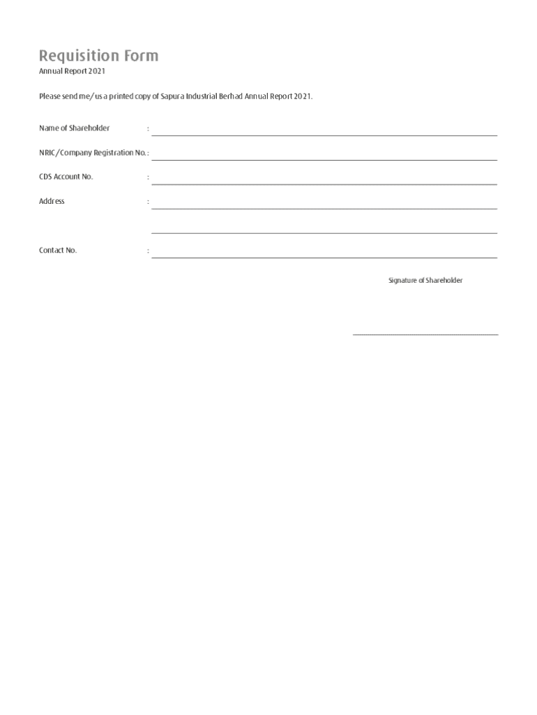 Requisition Form Annual Report 2021 Please send me/us a printed copy of Japura Industrial Broad Annual Report 2021. Name of Shareholder:ERIC/Company Registration No. CDS Account No.:Address:Contact