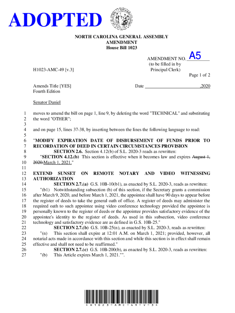 ADOPTED NORTH CAROLINA GENERAL ASSEMBLY AMENDMENT House Bill 1023A5 A5AMENDMENT NO. (to be filled in by Principal Clerk) Page 1 of 2H1023AMC49 v.3 Amends Title YES Fourth EditionDate,2020Senator Daniel