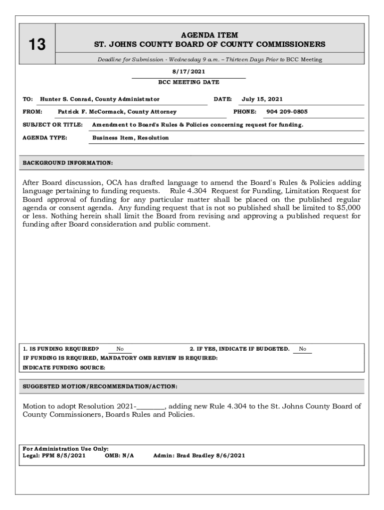 AGENDA ITEM ST. JOHNS COUNTY BOARD OF COUNTY COMMISSIONERS13Deadline for Submission Wednesday 9 a.m. Thirteen Days Prior to BCC Meeting 8/17/2021 BCC MEETING DATE TO:Hunter S. Conrad, County AdministratorFROM:DATE:Patrick