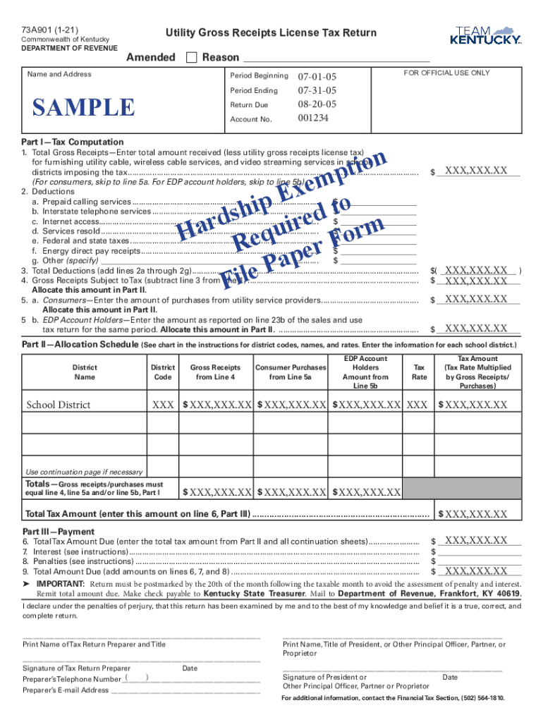 73A901 (121)Commonwealth of Kentucky DEPARTMENT OF REVENUEUtility Gross Receipts License Tax Return Amended Reason Name and AddressPeriod Beginning Period EndingSAMPLEReturn Due Account No. Part Tax