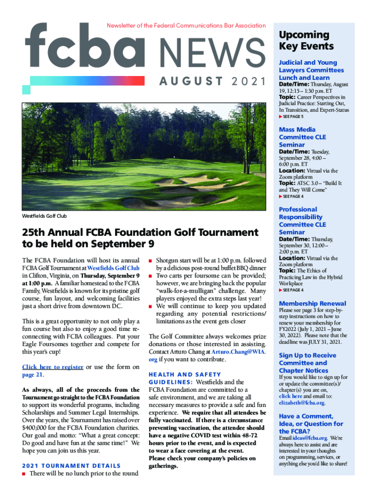 Newsletter of the Federal Communications Bar AssociationNEWSTHE TECH AUGUST 2021Upcoming Key Events Judicial and Young Lawyers Committees Lunch and Legendary/Time: Thursday, August 19, 12:15 1:30