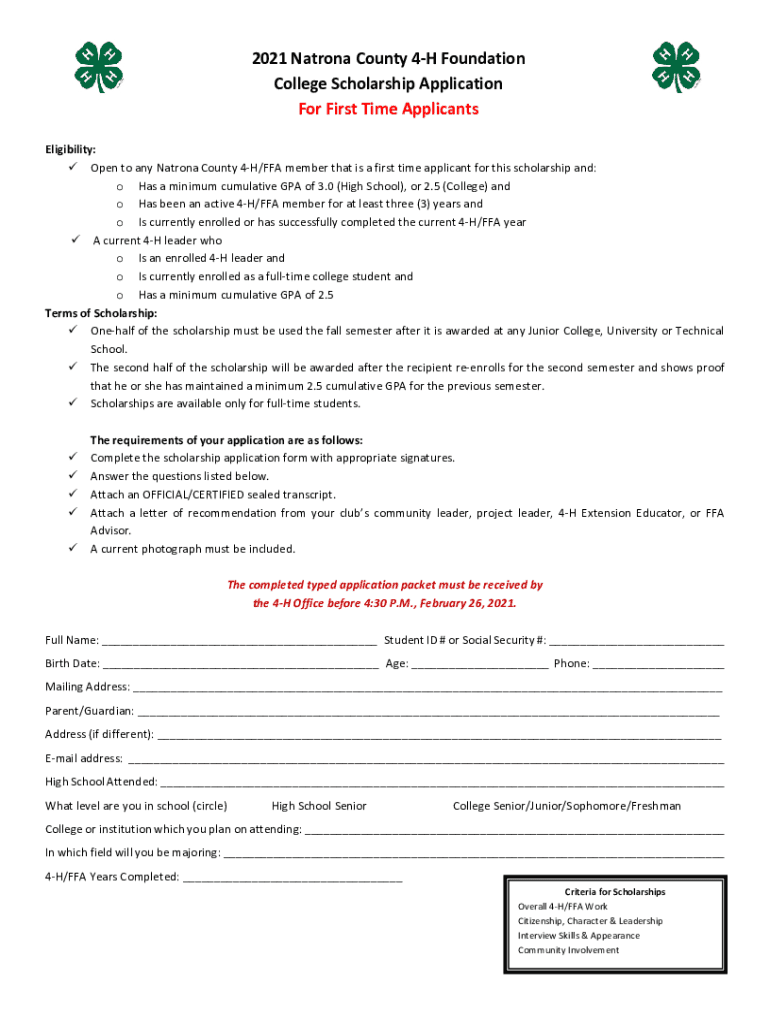 2021 Natron County 4H Foundation College Scholarship Application For First Time Applicants Eligibility: Open to any Natron County 4H/FFA member that is a first time applicant for this scholarship