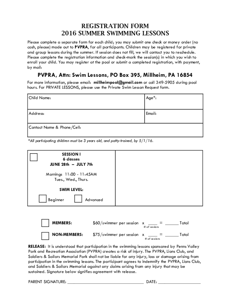 REGISTRATION FORM 2016 SUMMER SWIMMING LESSONS Please complete a separate form for each child; you may submit one check or money order (no cash, please) made out to PV PRA, for all participants. Children