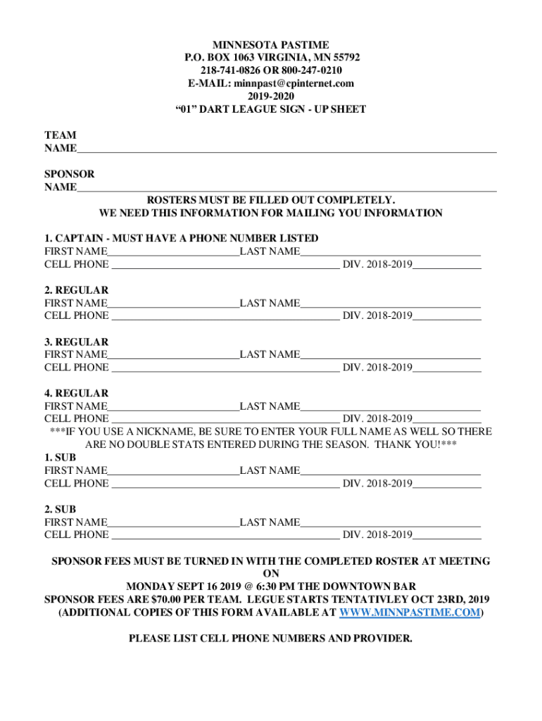 MINNESOTA PASTIME P.O. BOX 1063 VIRGINIA, MN 55792 2187410826 OR 8002470210 EMAIL: mainmast cpinternet.com 20192020 01 DART LEAGUE SIGN UP SHEET TEAM NAME SPONSOR NAME ROSTERS MUST BE FILLED OUT COMPLETELY.