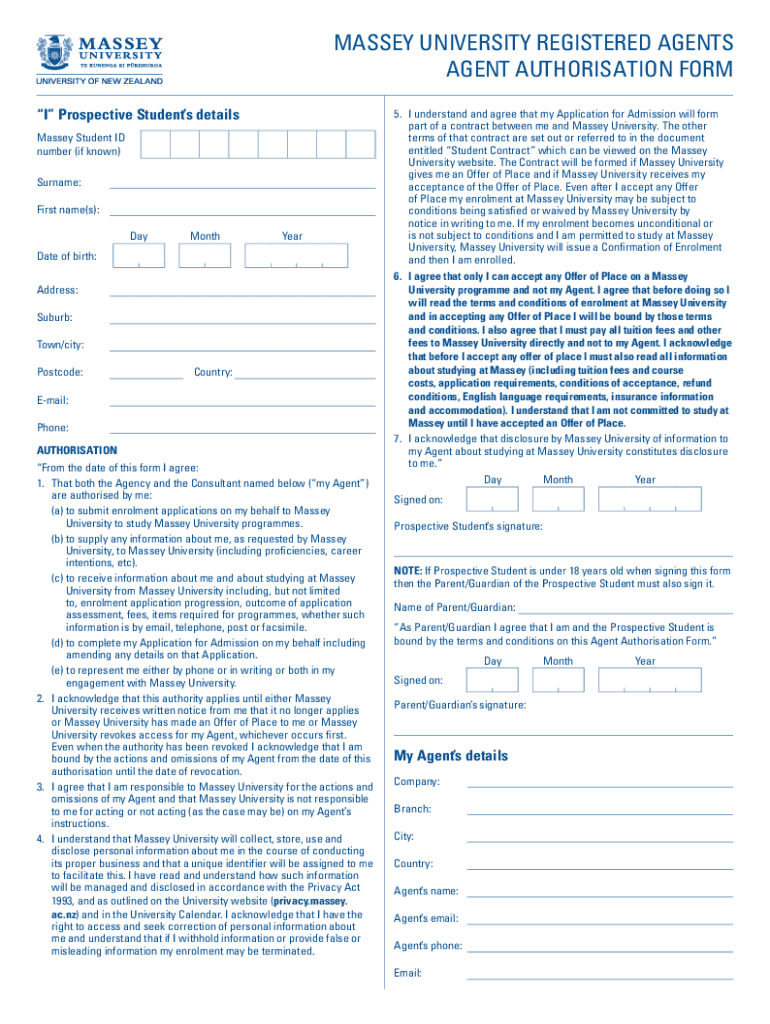 MASSEY UNIVERSITY REGISTERED AGENTS AGENT Authorization FORM I Prospective Students details Massey Student ID number (if known) Surname:First name(s): DayMonthYearDate of birth: Address:Suburb:Town/city:Postcode:Email:Phone:Country: