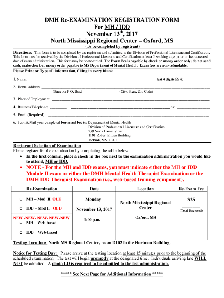 DM Reexamination REGISTRATION FORM For MH / ADD November 13th, 2017 North Mississippi Regional Center Oxford, MS (To be completed by registrant) Directions: This form is to be completed by the registrant