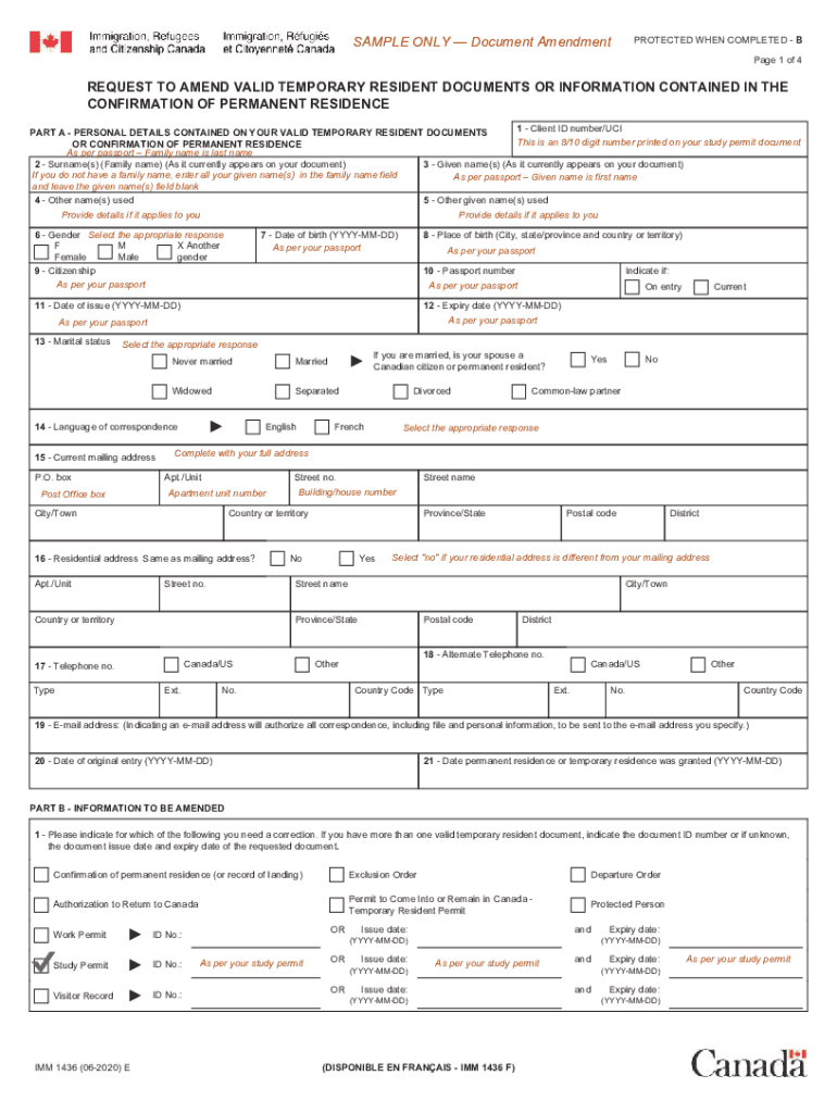 SAMPLE ONLY Document AmendmentPROTECTED WHEN COMPLETED B Page 1 of 4REQUEST TO AMEND VALID TEMPORARY RESIDENT DOCUMENTS OR INFORMATION CONTAINED IN THE CONFIRMATION OF PERMANENT RESIDENCE 1 Client