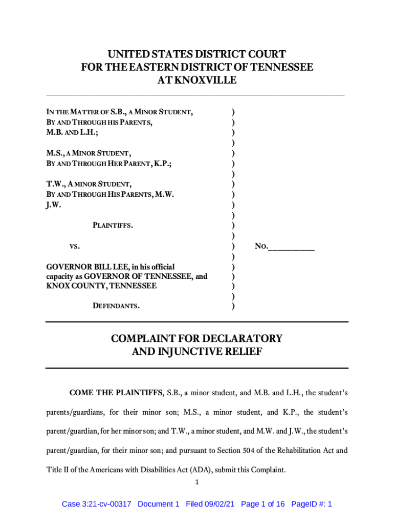 UNITED STATES DISTRICT COURT FOR THE EASTERN DISTRICT OF TENNESSEE AT KNOXVILLE IN THE MATTER OF S.B., A MINOR STUDENT, BY AND THROUGH HIS PARENTS, M.B. AND L.H.; M.S., A MINOR STUDENT, BY AND THROUGH